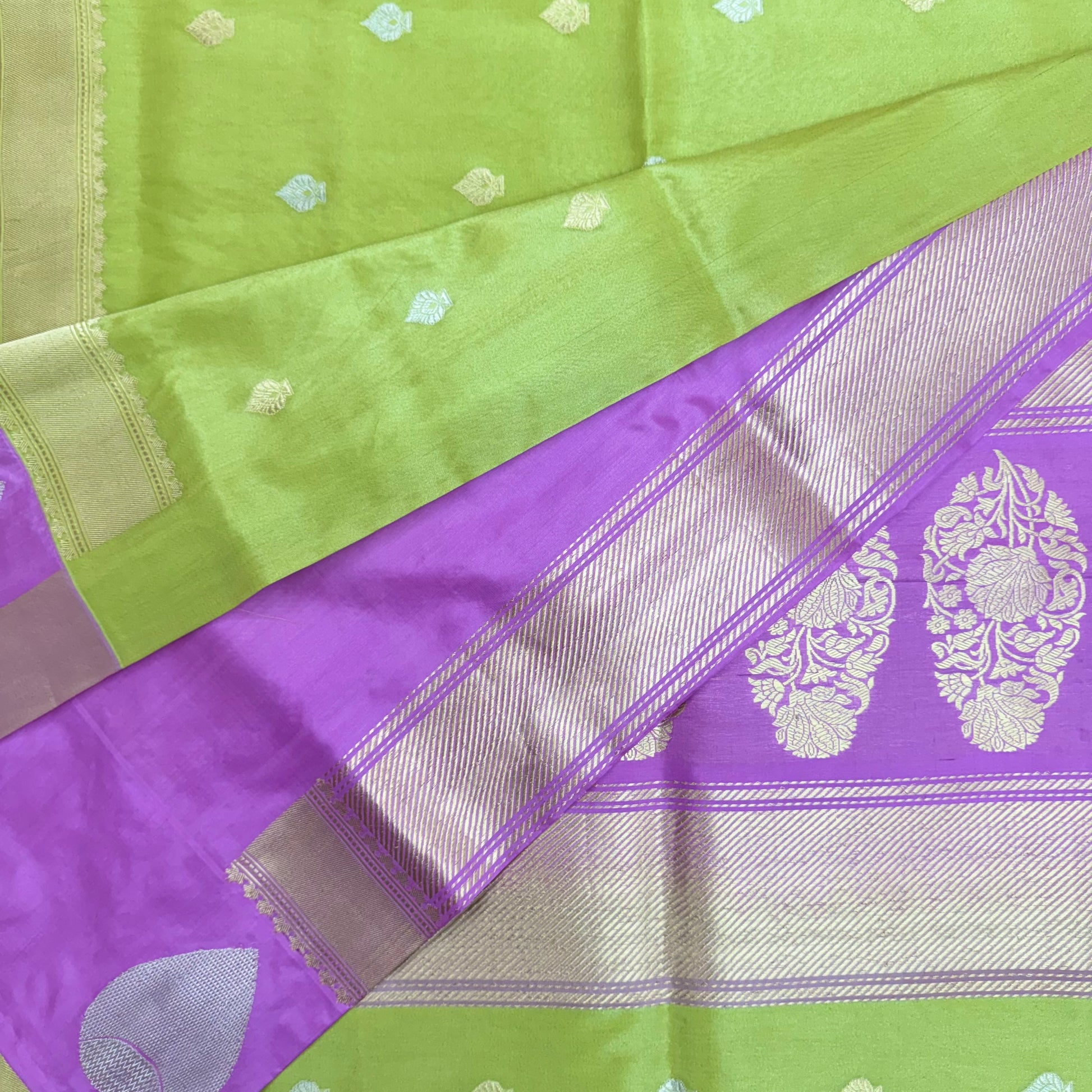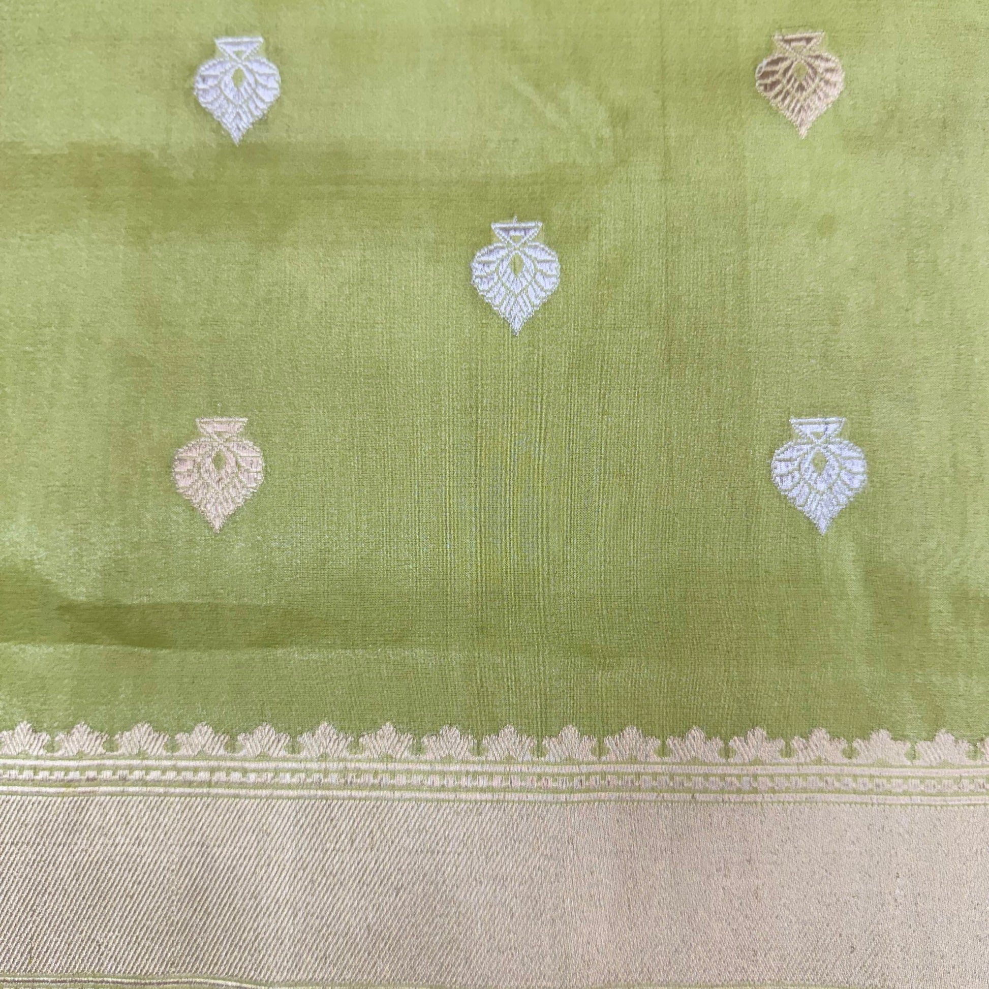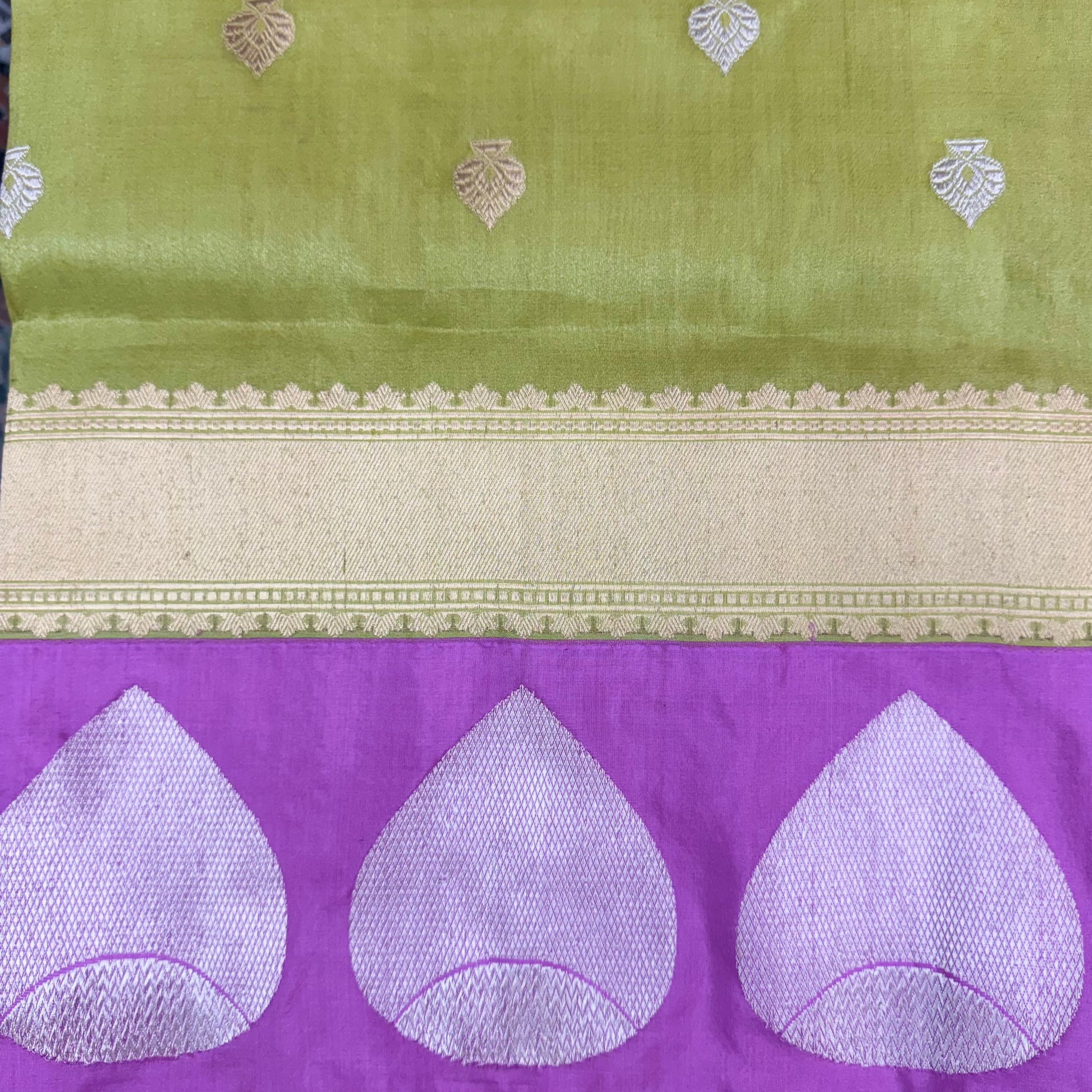 Pure Katan सिल्क Kadhua स्टाइल Butidar डिज़ाइन Floral बॉर्डर Olive Yellow बनारसी साड़ी