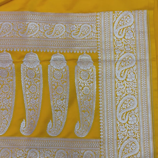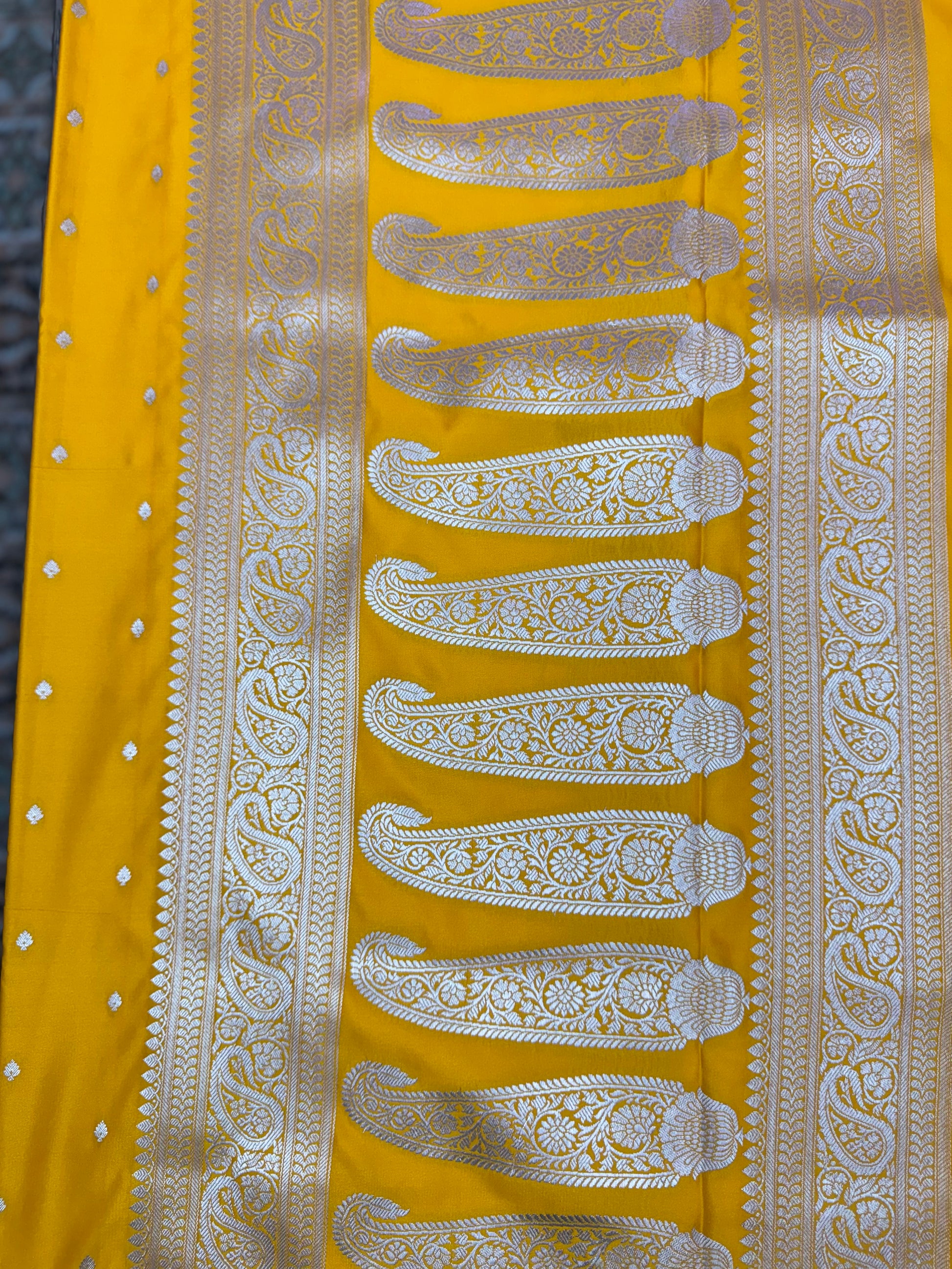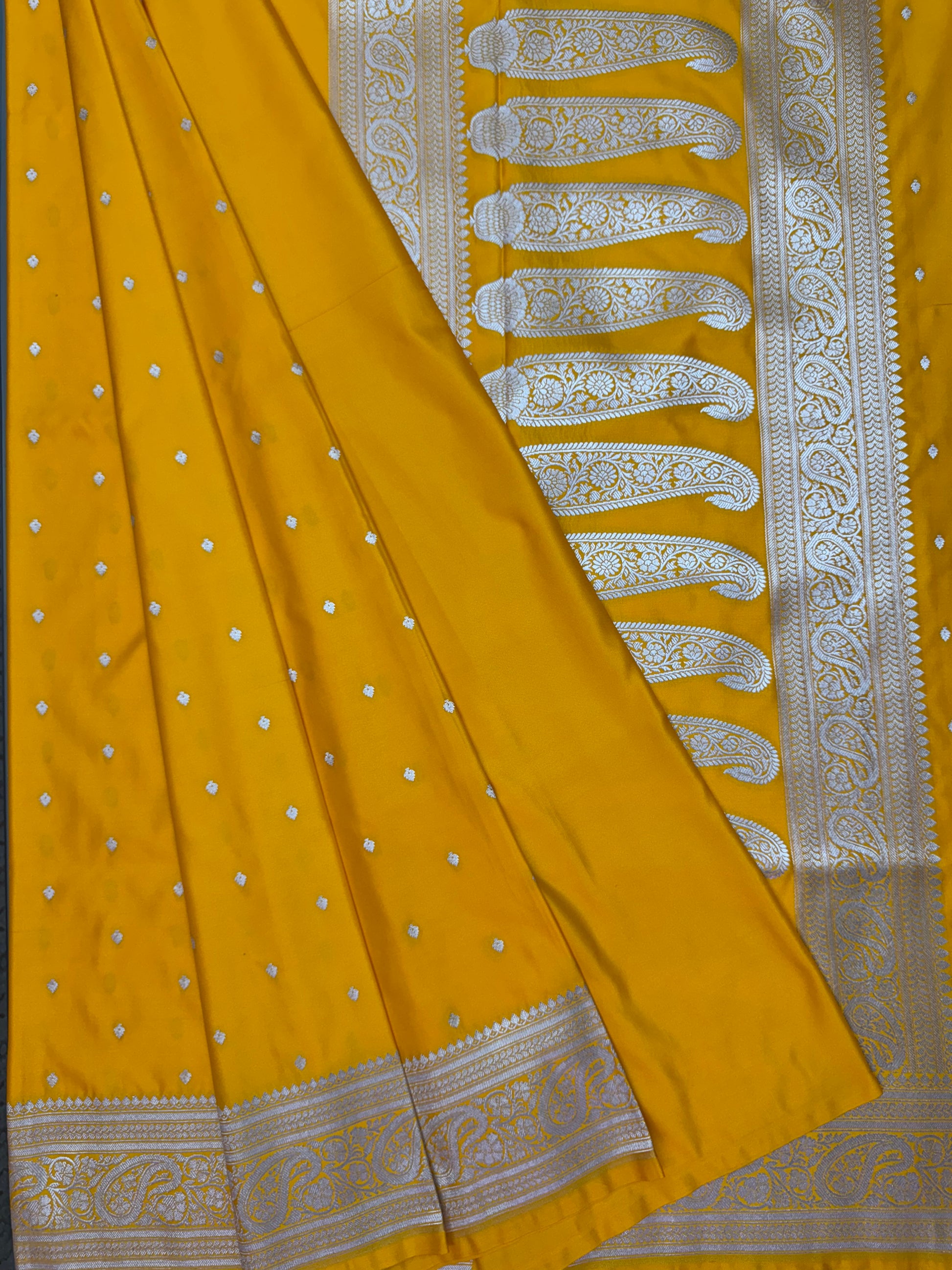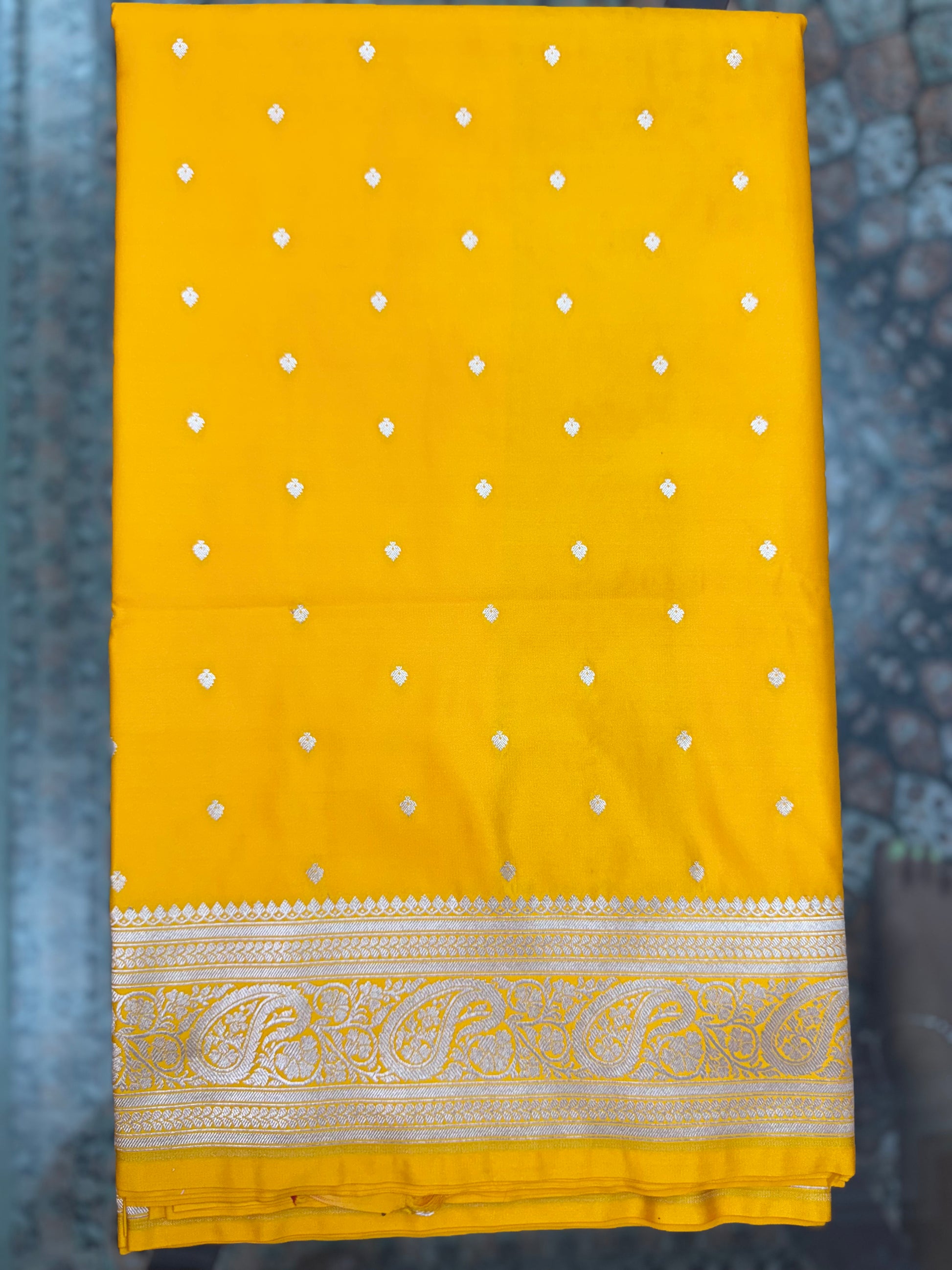 Mashru Silk Phekwa (Cutwork) Style Butidar Design Floral Border Golden-Yellow Banarasi Sari